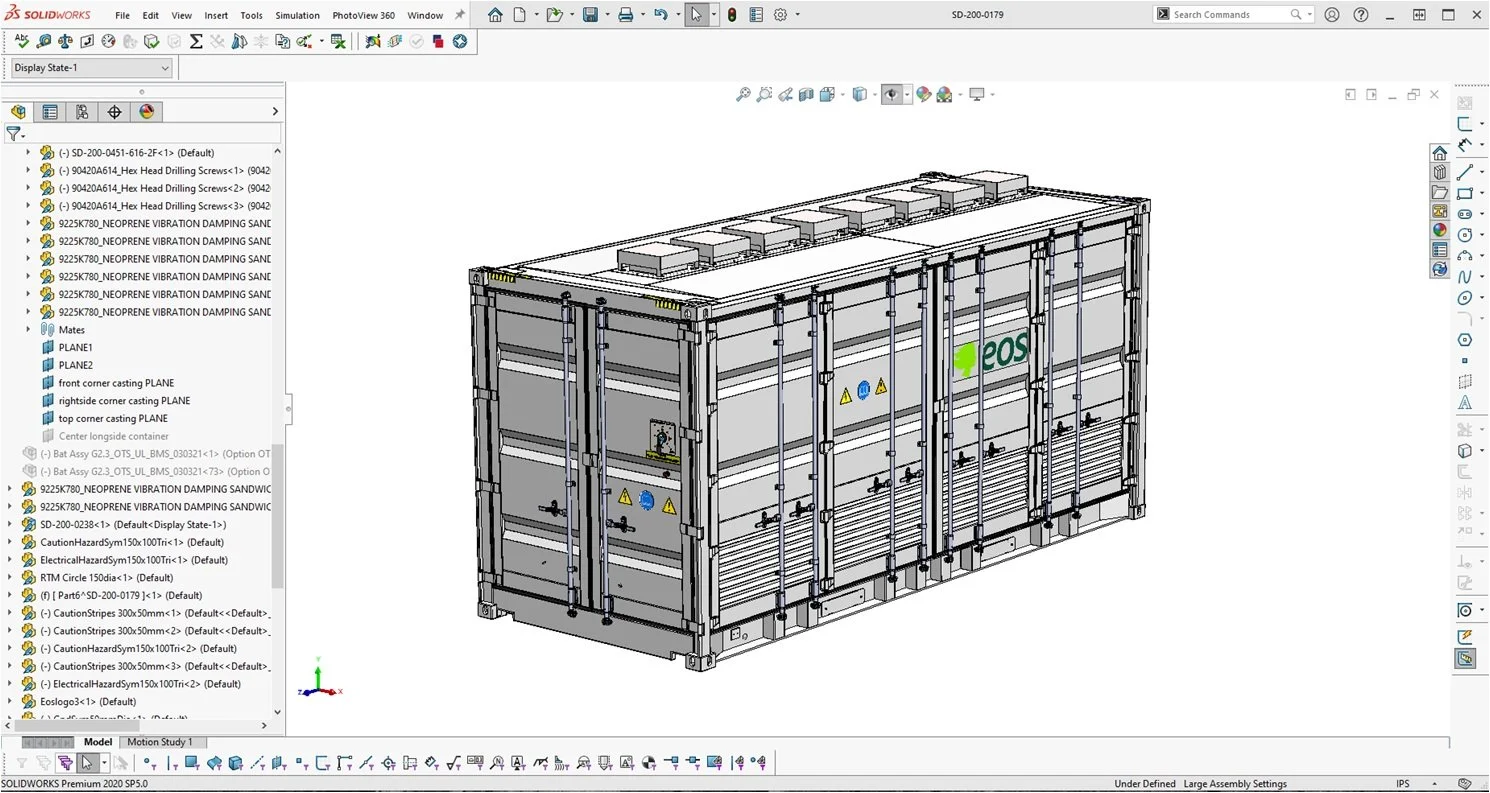 The company completed R&D and launched its first product in 2016 using SOLIDWORKS® CAD design software. Multi-year product development cycles ruled the day until the recent acquisition and merger with B. Riley Principal Merger Corp. “We were challenged to move the product forward and speed up development, which required straightening out all our drawings and files and re-designing the container that holds the 144 batteries that store power,” says Senior Mechanical Engineer David Dubois.